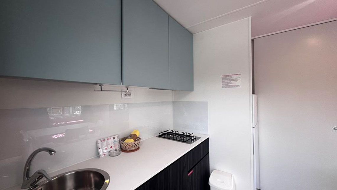 Neu für die Saison 2025: Das Mobilheim Mini Suite ist die beste Lösung für ein Paar, das seinen Urlaub genießen möchte in Privatsphäre und Komfort. Die Mini Suite empfiehlt sich auch für Familien mit 3 Personen, die Platz für ein zusätzliches Kinderbett oder die Nutzung des Schlafsofas im Wohnzimmer haben.