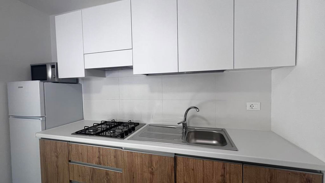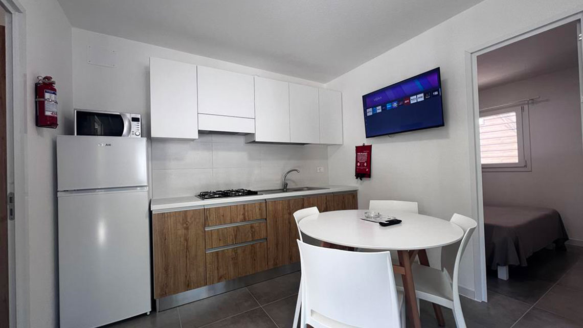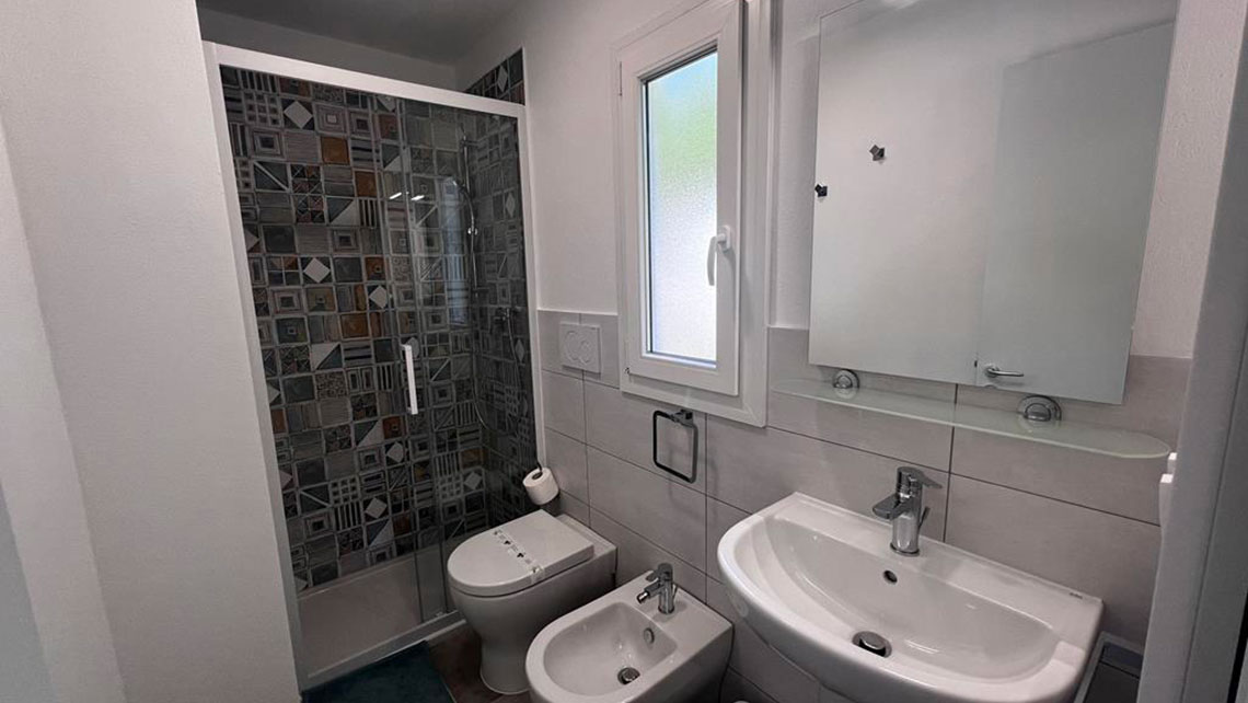 Taille cm. 850 x 410. 4+1 lits, 1 chambre double, 1 chambre avec 2 lits simples, séjour avec table à manger et canapé-lit, cuisine équipée avec lave-vaisselle, réfrigérateur et micro-ondes, salle de bain avec cabine de douche, lavabo, WC et bidet, équipée de coffre-fort, TV . Véranda attenante avec table et chaises.