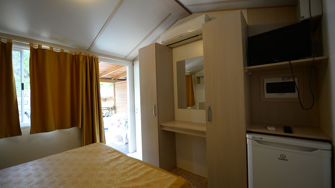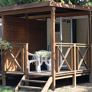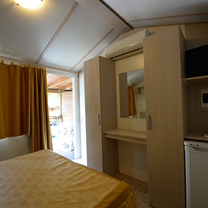 Dimensione cm. 400 x 300, 2 posti letto, 1 camera matrimoniale con armadio e scrivania, bagno con box doccia, lavello e wc, dotata di frigorifero, tv, aria condizionata. Terrazzo in legno con tavolo e sedie.