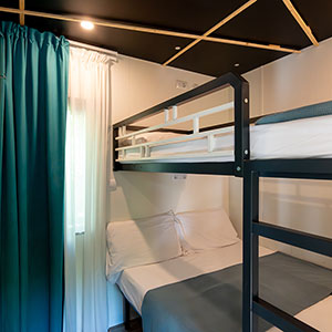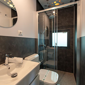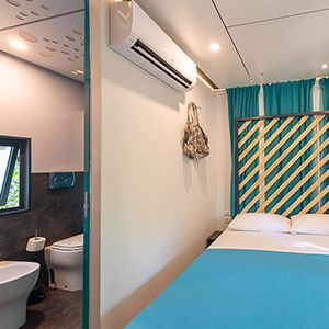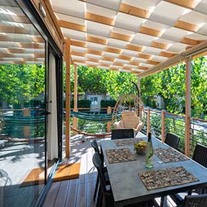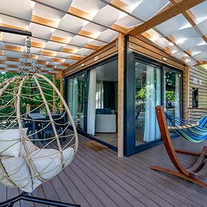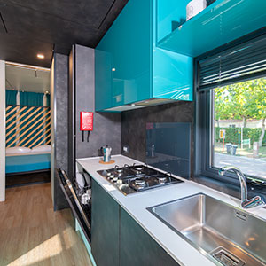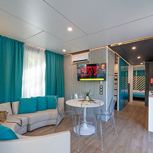 Un layout innovativo per una vera novità nella progettazione delle mobile home: il soggiorno viene decentrato, garantendo così una maggiore apertura e un miglior contatto con la veranda. Le ampie vetrate donano una nuova luminosità alla casa: se mantenute completamente aperte rendono possibile una vera e propria fusione tra la vita all’aria aperta e quella all’interno della casa.